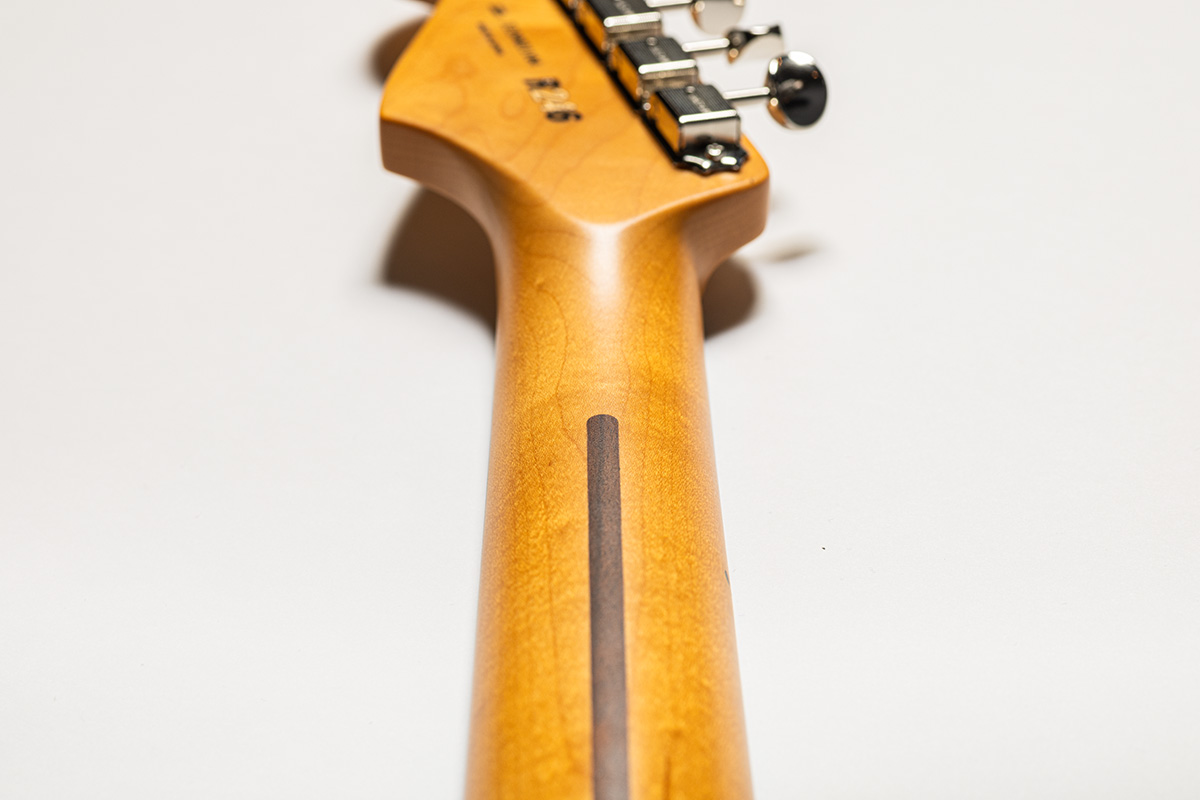 少し前に、ボディとヘッドを94%に縮小しているMade in Japan Junior Collectionというシリーズがリリースされていて、それを採用したらレギュラー・スケールの24フレットとストラトキャスターのルックスを両立できるんじゃないかというアイディアがありました。それからプロトタイプを作ってもらい、ヘッド落ちがしないかなど、いくつかの実験を行なったうえで今回の仕様になりました。