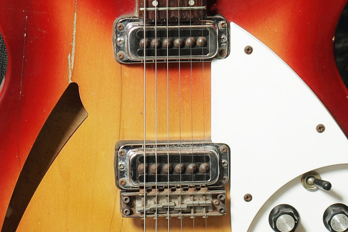 リッケンバッカーは基本的に半音下げチューニングにセッティングされている。そのため弦はErnie Ballの.011〜.048(Power Slinky #2220)という少し太めのゲージを使用。それに合わせてブリッジ・サドルの溝も調整しているとのこと。