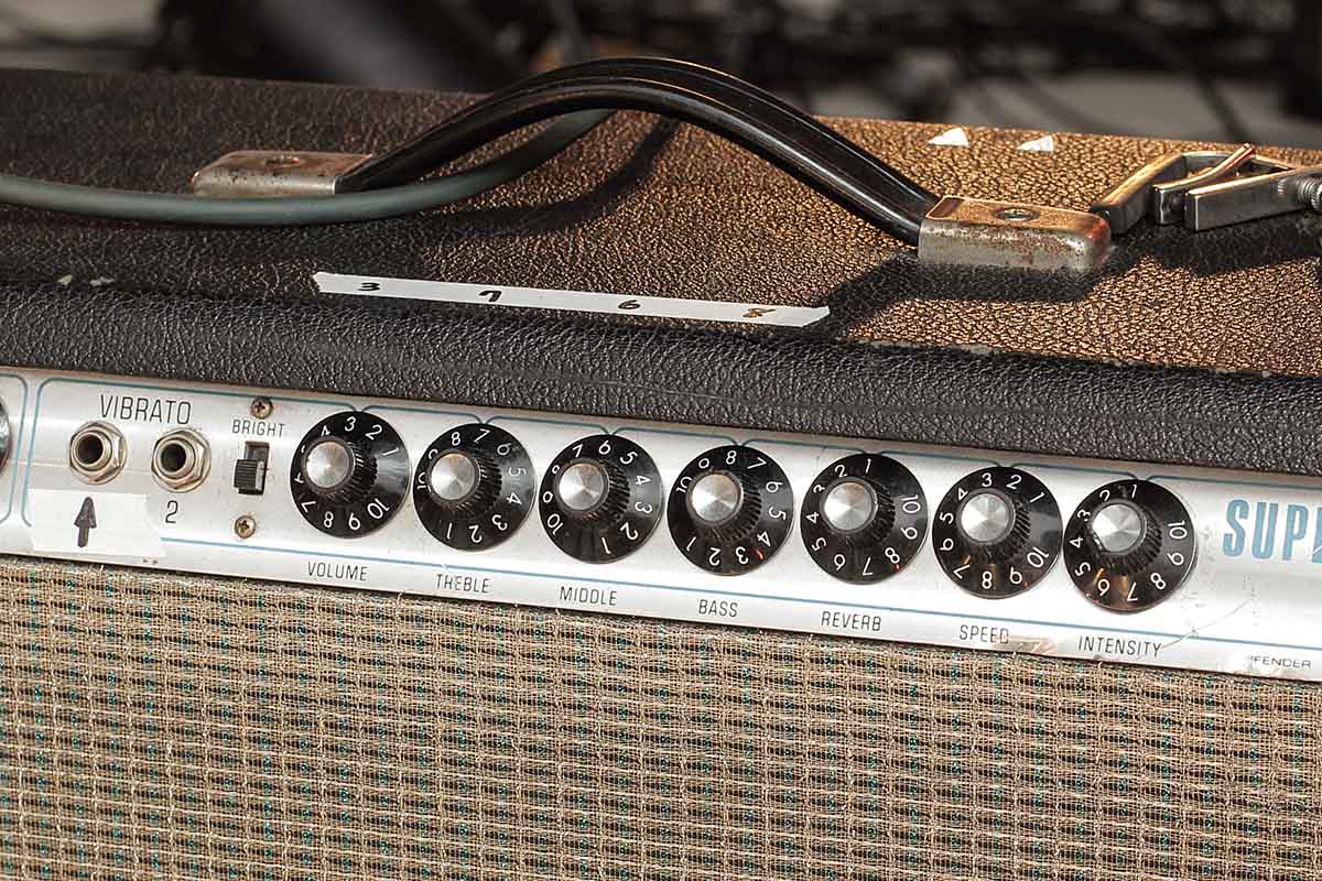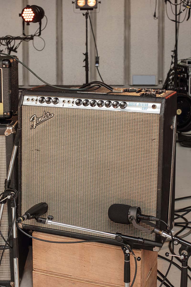 Super ReverbはVIBRATO chの1にインプット。BRIGHTスイッチはオフで、各ノブはVOLUMEが3、TREBLEが7、MIDDLEが6、BASSが8にセッティングされていた。リバーブとトレモロは未使用。クリーン・サウンドのため、足下にあるKlon / KTR(オーバードライブ)でクランチを作っている。
