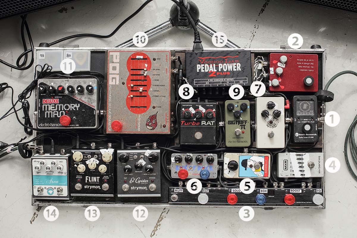 最も使用頻度の高い⑥Box Of Rockは右側のRock chのみを使用しており、左側のBoost chは未使用。オンにした時にコード感が失われないように、DRIVEノブは12時とやや控えめ。「母乳」のソロと「SURRENDER」の間奏では、最も音量が稼げる⑨Green Russian Big Muffを踏んでいた。