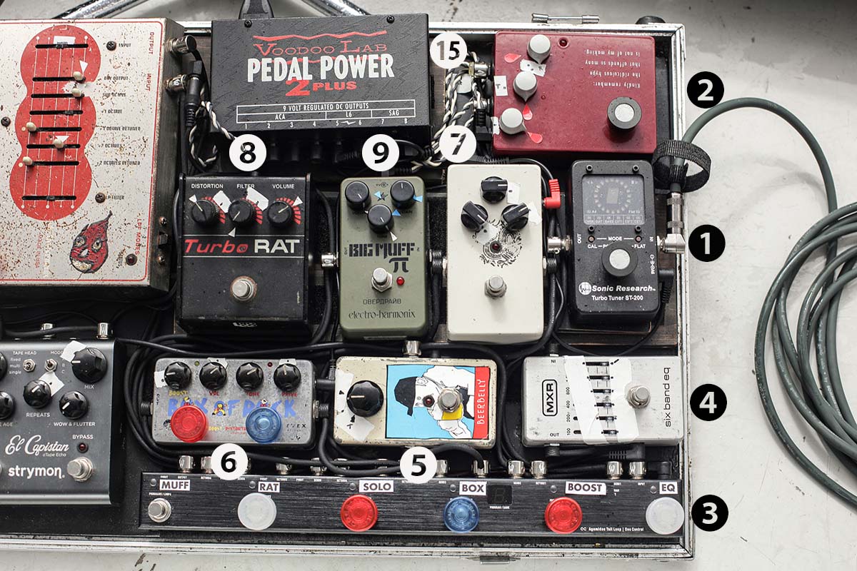 ⑥Box Of Rock、⑧Turbo RAT、⑨Green Russian Big Muffの3台はJCM800 2203のブースト用で、音圧を出したい時や、サステインを伸ばしたい時など、フレーズごとにそれぞれを踏み分けている。