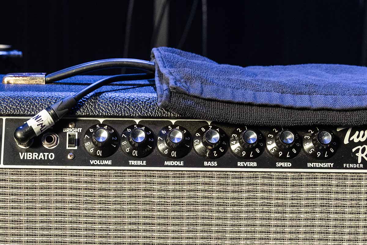 ’65 Twin ReverbはVIBRATO chの1にインプットし、BRIGHTスイッチはオフ。各ノブは、VOLUMEが4.5、TREBLEが5手前、MIDDLEが4.5、BASSが7にセッティングされていた。リバーブとトレモロは未使用。