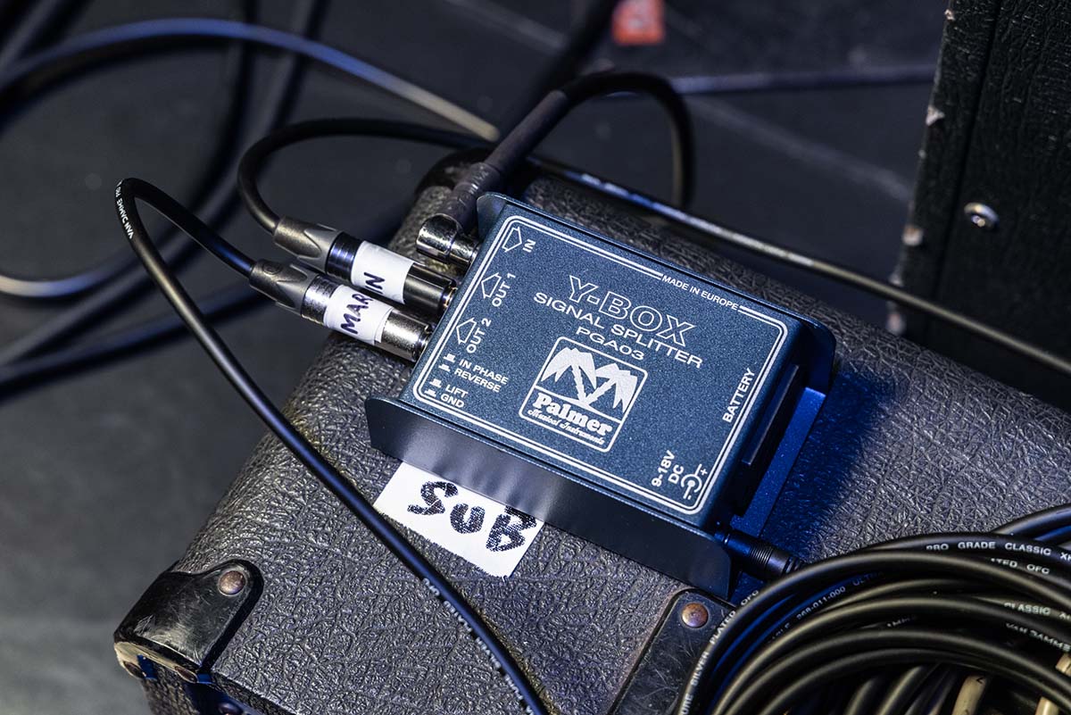 アンプの裏にはPalmer / PGA03(スプリッター)が置かれていた。ペダルボードから送られた信号を本機で2つに分岐し、2台のアンプに振り分けている。