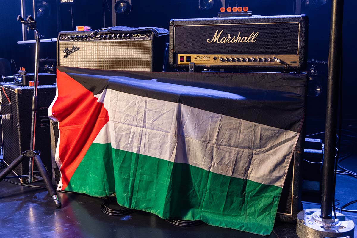 スチュワートが使用したアンプは、フェンダー’65 Twin ReverbとマーシャルJCM900 4100の2台。どちらも日本でレンタルしたものだが、長年このセットを愛用している。この日はパレスチナの国旗がセットされていた。