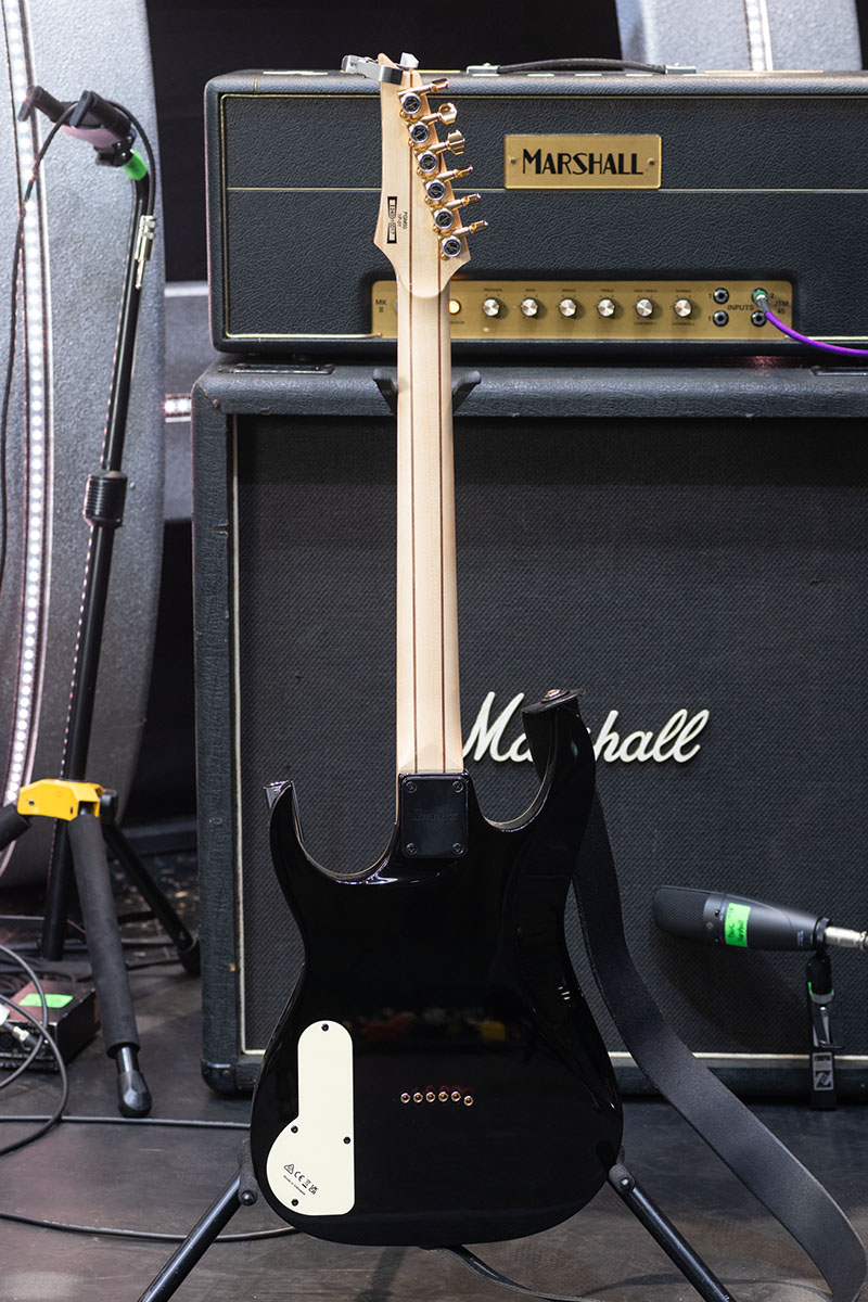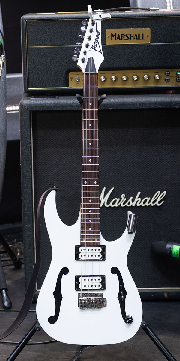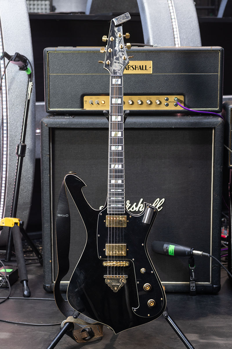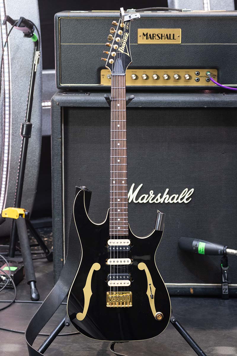 Ibanezのカスタム・ショップにオーダーしたというワンオフもののFRM。ポールは入手時期について詳しくは覚えていなかったが、2011年頃には確実に使用していたとのこと。通常のIbanezのギターよりもナット幅を狭めているのが特徴と語る。