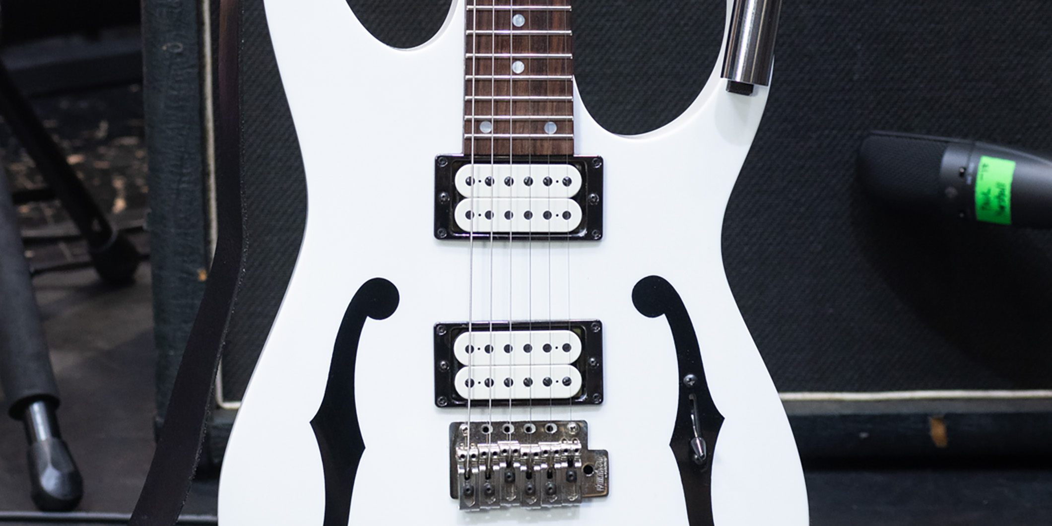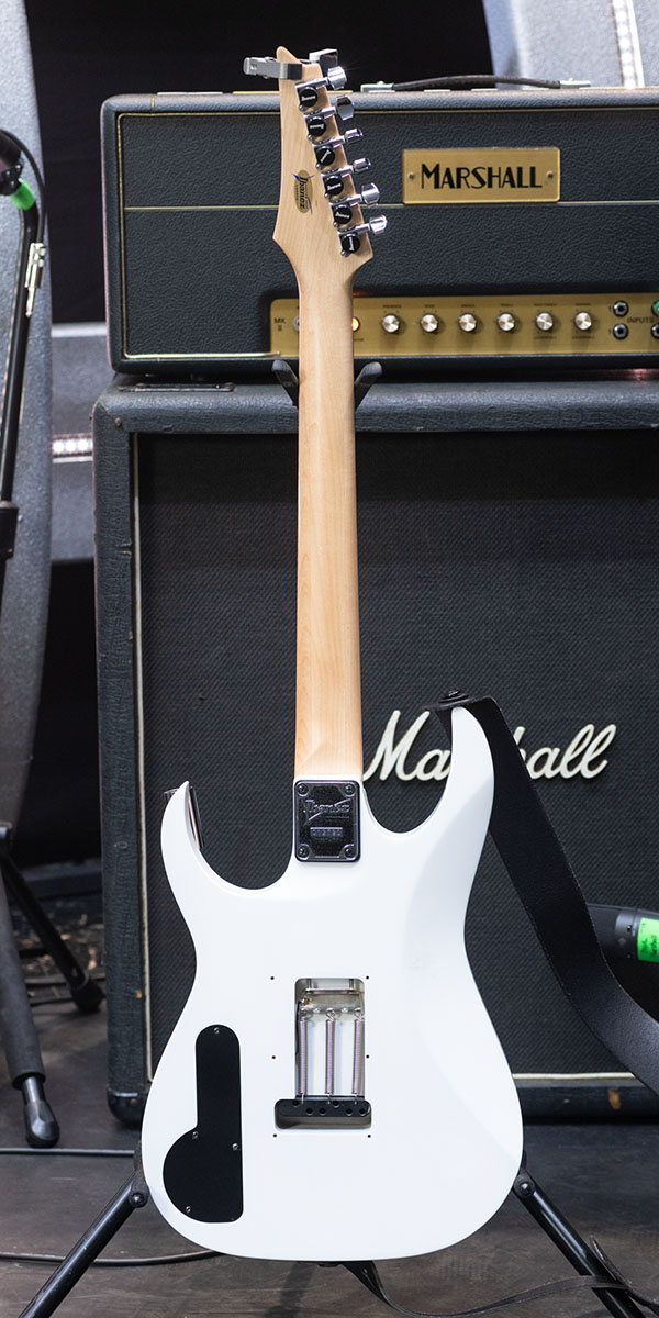 さらにIbanezカスタム・ショップによりオリジナルのロッキング・トレモロ・ユニットがはずされ、周辺の大きな穴を埋め、ブリッジもハードテイル・タイプに換装。ナットもオリジナルはロック式だが、ロック部分が取りはずされていた。1弦側のホーンの形がおかしいのは、ポールがノコギリで切り落として少し短くしたため。