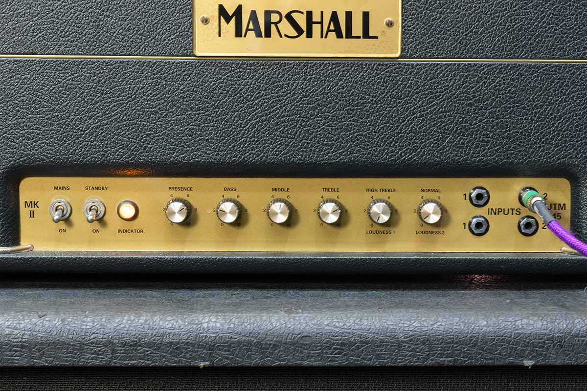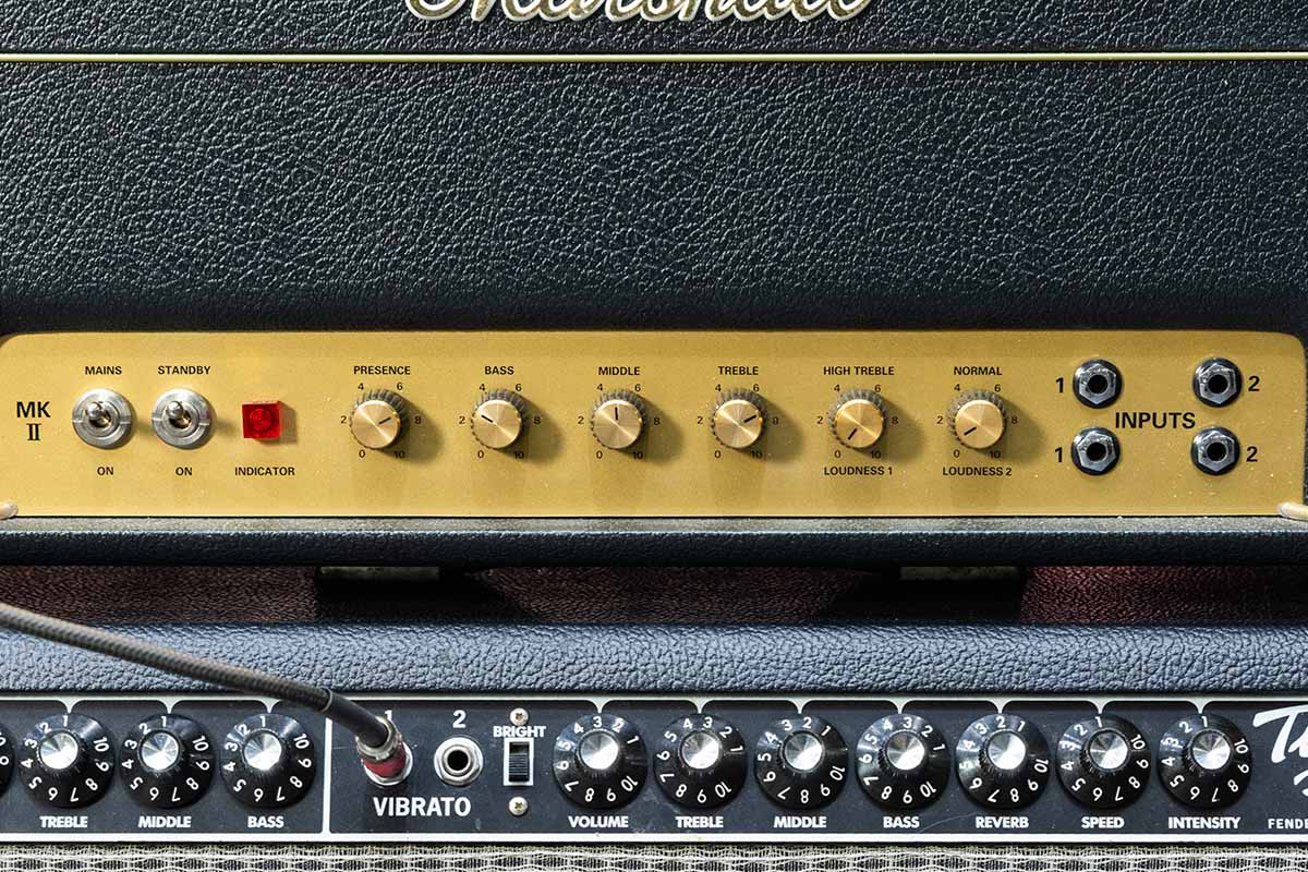 上に置かれたサブ用のマーシャル1959SLPのノブは、メインのJTM45/100と同じ位置にセッティング。