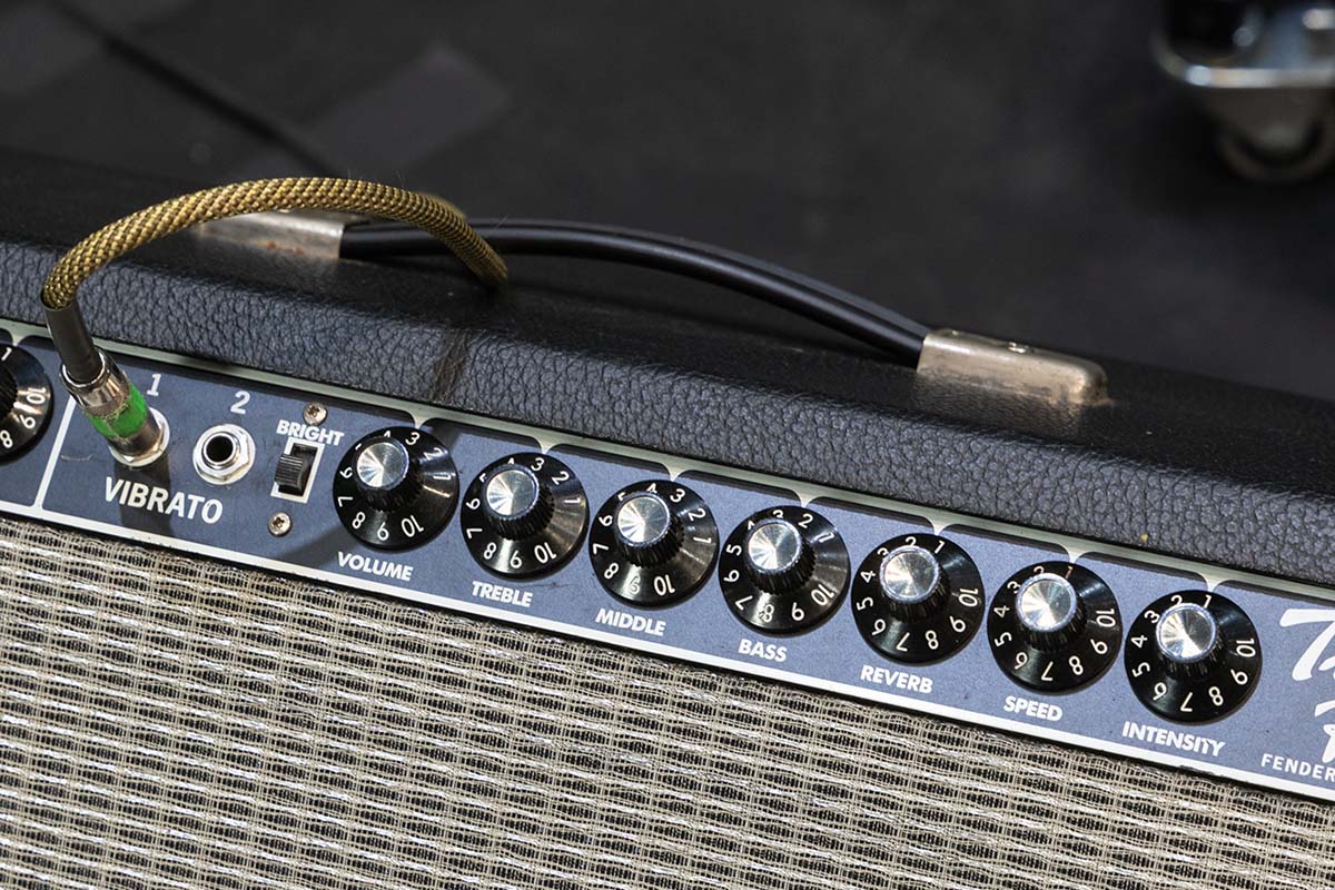 ポールの目の前に置かれた’65 Twin Reverbは、VIBRATO chの1にインプット。BRIGHTスイッチをオフにし、各ノブはVOLUMEが3、TREBLEが3、MIDDLEが3.5、BASSが2過ぎ、REVERBが1過ぎにセッティングされていた。トレモロは未使用。