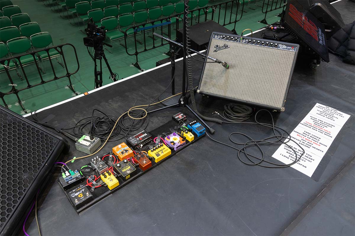 ペダルボードには気に入った3~4台の歪みやブースター、コーラス、クリーン・サウンド用のコンプレッサーを入れている。これがあると、どんなにクリーンなアンプを使ってもペダルを頼った音作りができるんだ。インドでのライブではマーシャル1959SLPが手配できなくて、Ampegのベース用のSVTを用意してもらったんだけど、ラウドでクリーンなサウンドが出ることはわかっていたし、実際にグレイトな音だったよ。