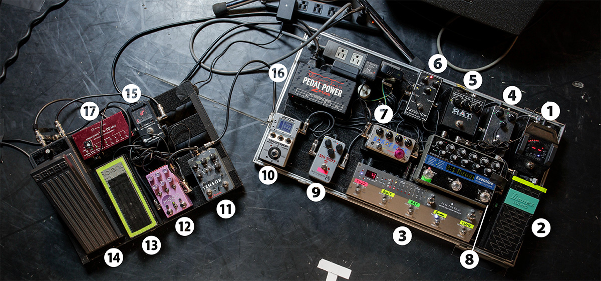 伊藤のペダルボードは、歪み、フィルター、空間系をまとめたメイン・ボード(右側)と、飛び道具系ボード(左)の2枚組。