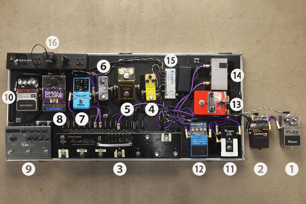 僕は昔からオクターブ上が出せるBOSSのPS-2(⑫)を使っているんですけど、オクターブ下も出したくて。PS-2でも出せるんですけどね。それでOC-5を試してみたら凄く良かったんです。新しいアルバムの曲でけっこう使うことが多くて。