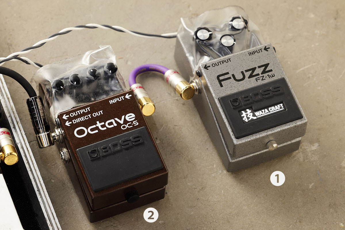 ②OC-5はPOLYモードにセッティング。RANGEノブが和音の最低音のみに効果がかかるLOWESTに、そして+OCT LEVELノブがゼロに設定されており、「Slow Dance」のソロ、「星の少年」と「最後の少年」のリフ、「笛吹かぬとも踊る」のソロなど、オクターブ下のみを出す際に使用している。逆に⑫PS-2はオクターブ上のみを出す用途という使い分け。しかしモーターヘッドのカバー曲「Ace Of Spades」のソロでは、なんと②OC-5と⑫PS-2の2台を同時に踏んで上下のオクターブを出してるとのこと。