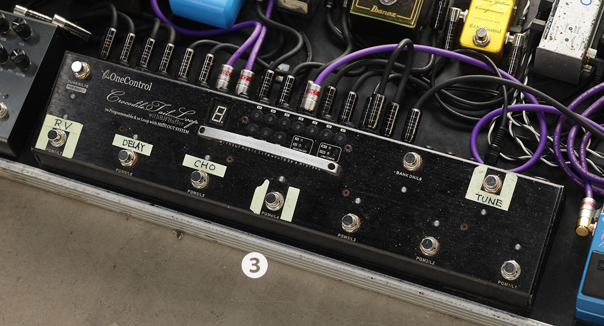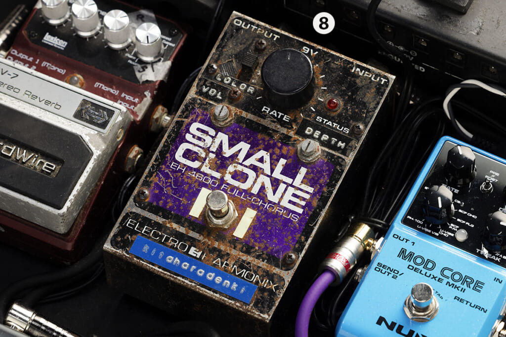 それまではMXRのPhase 90を入れていたんですけど、これを最近送ってもらったんです。Mod Core Deluxeにはエフェクトが色々入ってるでしょう? 僕、フット・スイッチでエフェクトを切り替えられると思ってたんですよ(笑)。でもできなかったのでSmall Clone(⑧)も入れていますね。