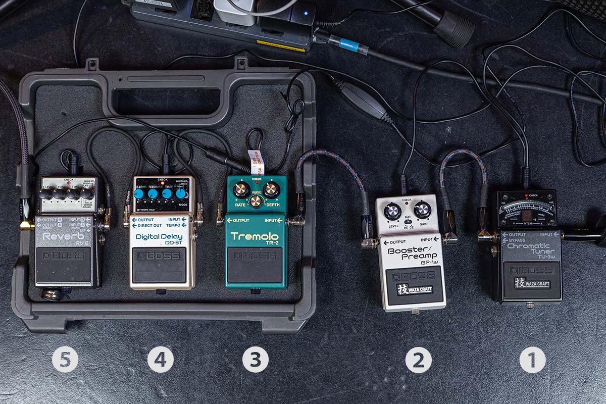 ギターからの接続順は①〜⑤の番号どおりで、⑤RV-6からフェンダー’65 Deluxe Reverbにインプットされる。アンプはクリーン・セッティングで、楽曲により②BP-1Wをオンにして軽いサチュレーションを作っていた。モード・スイッチはNATURALを選択。「Kyoto」、「English Football At The Prince Hotel」、「Land Of Music」、「Good Lady Of Toronto」の4曲は②BP-1Wのみのサウンドで演奏したとのこと。