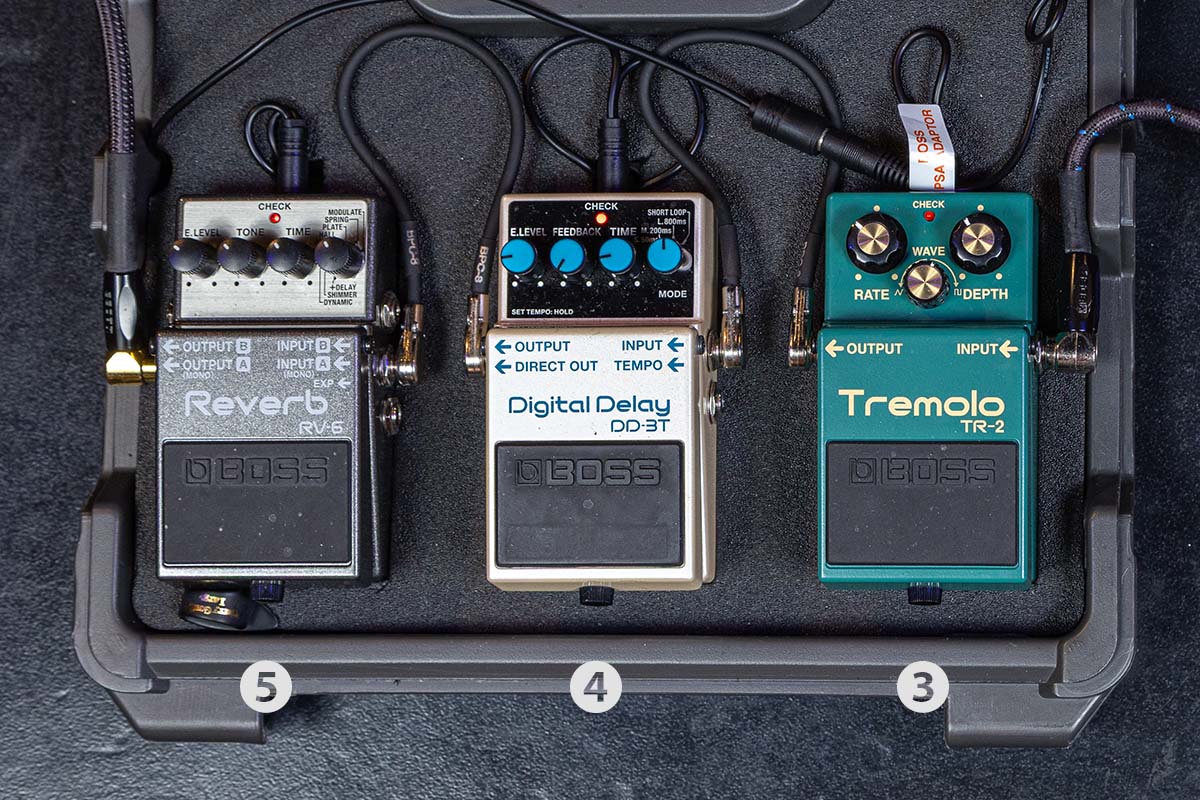 よし、教えてあげるからセットリストを取ってくるね。……例えば「On The Bandstand」では、BP-1WとDD-3T(④)のスラップバック・ディレイを少し使っている。今回のライブではロング・ディレイを使っていなくて、ディレイは全部タイトで短めにしているんだ。全体的にロックっぽい曲ではDD-3Tのスラップバック・ディレイを使って少し太めのサウンドにする傾向があるね。