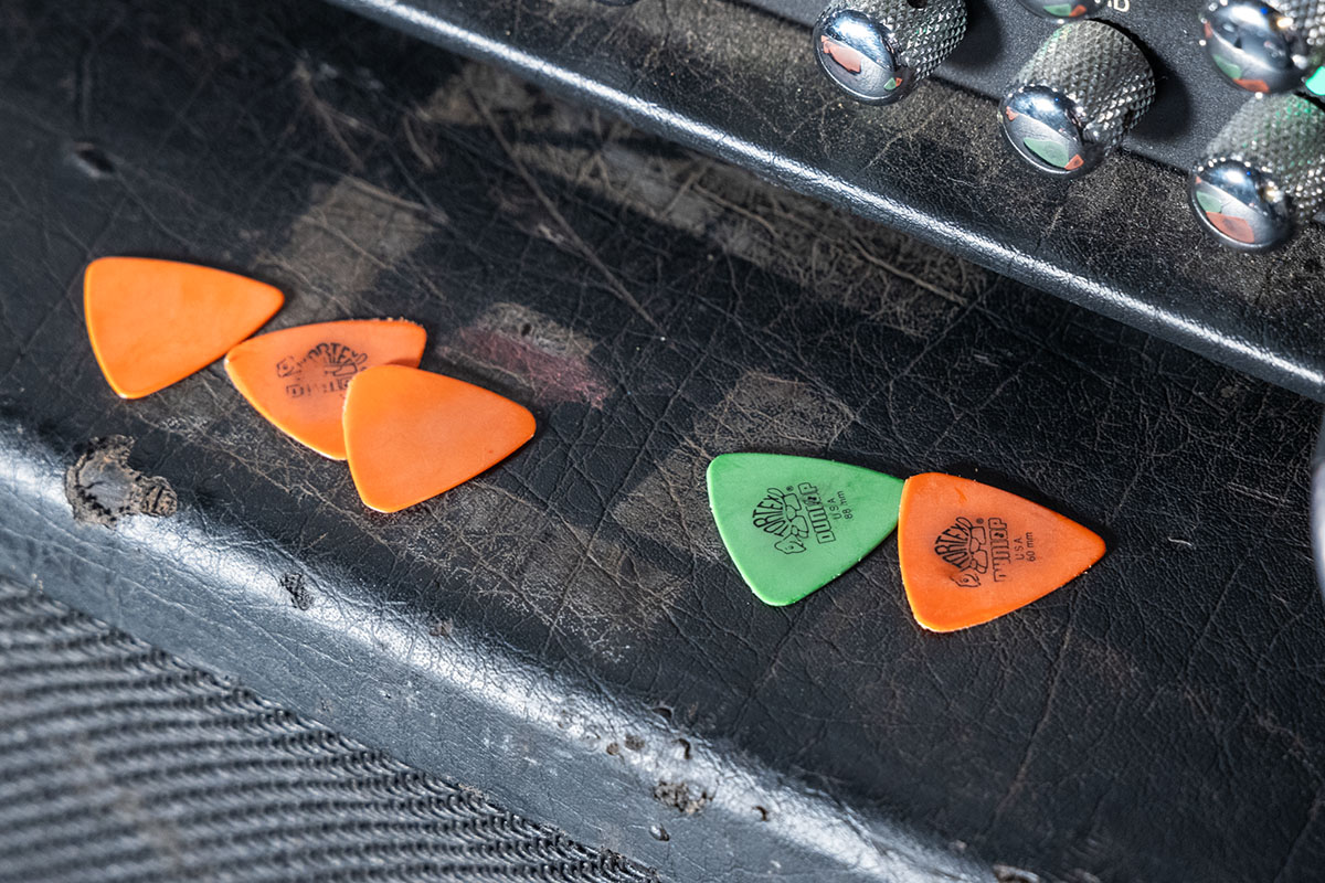 ずっとJim Dunlopのオレンジ(0.60mm)を使ってたんだけど、緑(0.88mm)に変えたらかなり違って。オレンジだと弦に人差指の爪が当たって、爪が削れてなくなっちゃってたんだよね。痛くなるから緑に変えてみたんですよ。そしたら雰囲気は良かったんだけど、オレンジの柔らかさに慣れてるからピッキングが強くて、弦が切れるようになっちゃって。Elixirでもライブ2日目で切れるから、今は毎回弦を替えてる。今でもたまに曲によってオレンジを使うけど、トレモロ・ピッキングをする時は確実に緑のほうがいい。オレンジだと柔らかすぎる。