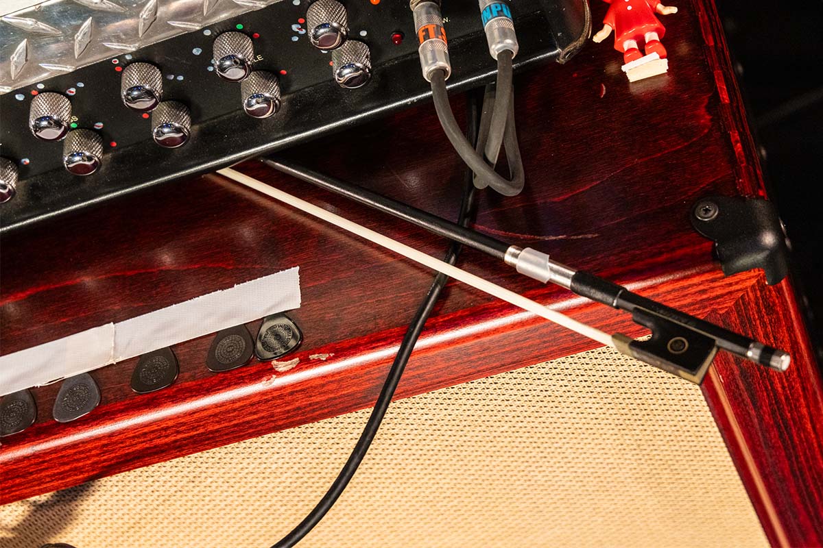yOshiが「Piecemeal」と「Rhythm」で使用するバイオリンの弓。ピックはJim DunlopのPrime Grip Delrin 500 0.96mmを愛用している。