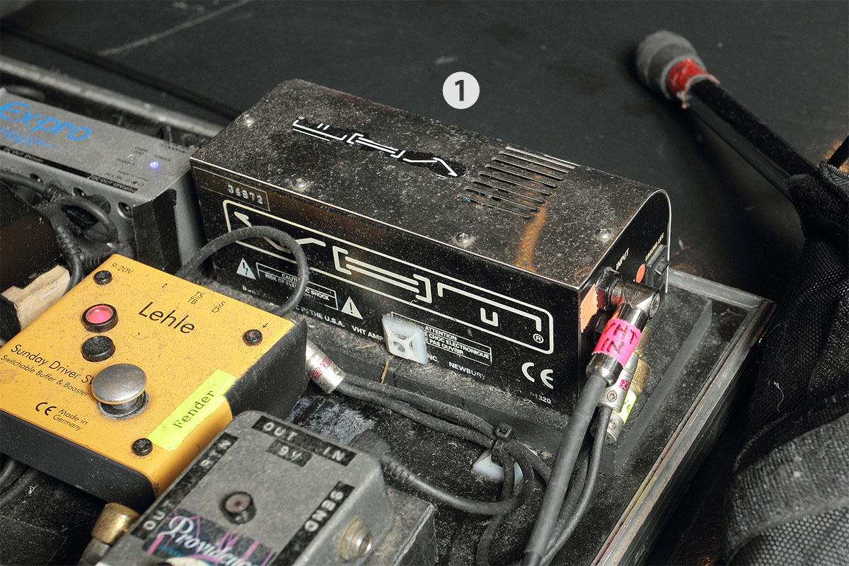 大木はAD140 Leadをクリーン・サウンドに設定しており、歪ませる際は20年以上愛用している④Tube Factorをオンに。つまり、AD140 Leadのクリーン/④Tube Factorの歪み/④Tube Factorの歪み + Super-Sonic 60の歪み、という3つのバリエーションがあり、これらをフレーズによって使い分けている。本来、④Tube Factorは右側のフット・スイッチでブーストが可能なのだが、ブースト・チャンネルは常にオンでセッティングしており、誤ってオフにならないようにスイッチが取りはずされていた。