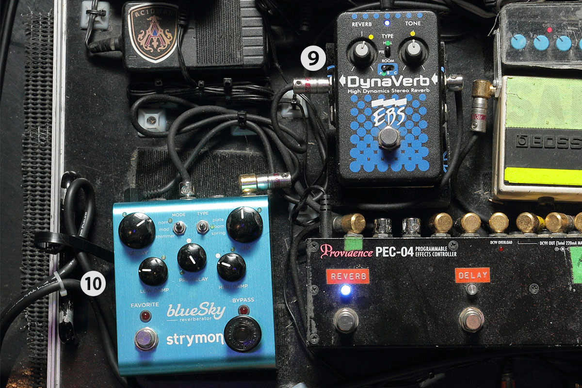 ⑨DynaVerdと⑩blueSky V1は⑤PEC-04の同じループ内に接続されており、楽曲によってどちらか1台のみを使用する。⑨DynaVerdはHALLモードにセッティングし、「夜のために」のAメロ、「FREE STAR」のイントロ、「カタストロフ」のAメロなどでオンにしていた。響きがデッドな会場では常時オンにすることもあるという。⑩blueSky V1はnornモード、roomタイプにセッティングし、幻想的なリバーブが必要な「風追い人(前編)」と「water room」の2曲で使用。