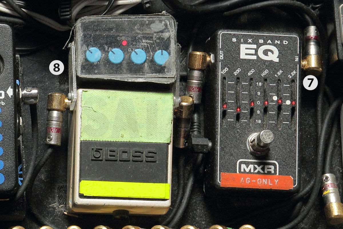 ⑧DD-5は800msにセッティング。ライブではショート・ディレイにセッティングして音をにじませたい時に踏むそうだが、本機のREVERSEモードのかかりがほかのディレイ・ペダルとは違い、レコーディングでリバース・ディレイが必要な時に活躍しているとのこと。