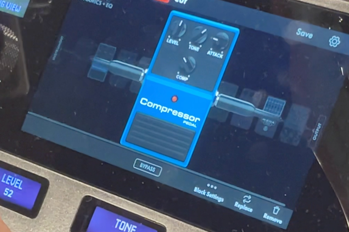 実際に今からプリセットを直してもいいですか? 今、とある楽曲の中で使うコンプが強いなと思っていたので、それを弱めてみます。それと、ちょっと尖っていたのでTONEを下げて……。セーブはフット・スイッチを長押しして終わり。