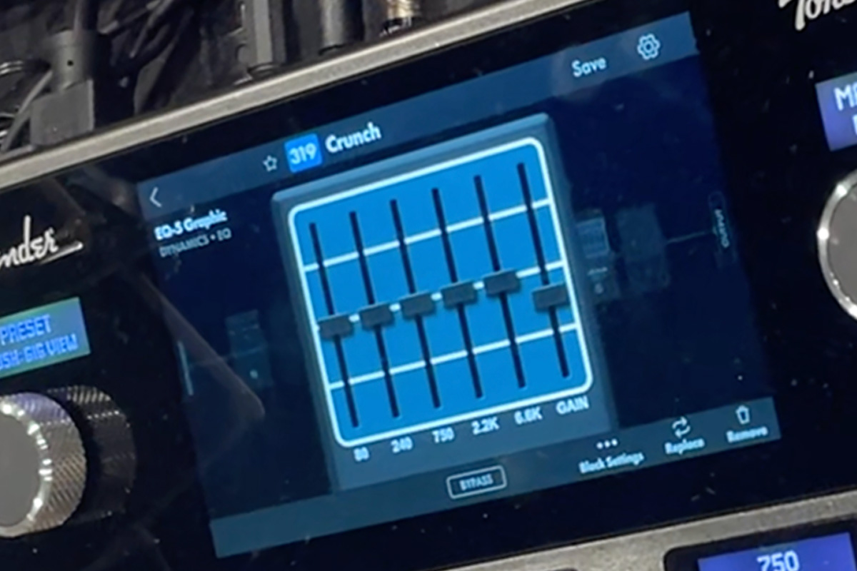 そうなんですよ。僕は全部のプリセットの後段にEQのエフェクト(EQ-5 Graphic)を入れているんですけど、音量がデカいな、もしくは小さいなと思ったら、EQのGAINで音量の調整ができるんです。こうすれば演奏中でも数小節の間にパッと直せる。これが凄いなと。今まではリハが終わってから“あの曲はこうしようか、ああしようか”って何回もやっていたことを、たった3秒で変更してセーブできますからね。