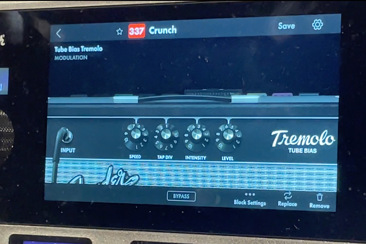 ②Tone Master Proでは楽曲ごとにバンクを作成。様々なアンプ・タイプやエフェクトを使用しているが、クリーンのサウンドはTwin Reverbのアンプ・タイプ、歪みのサウンドはおもにSoldano系のアンプ・タイプがプリセットされていた。どのプリセットも後段にEQ(EQ-5 Graphic)が配置されており、春畑は音量の微調整をEQのGAINコントロールで行なっている。