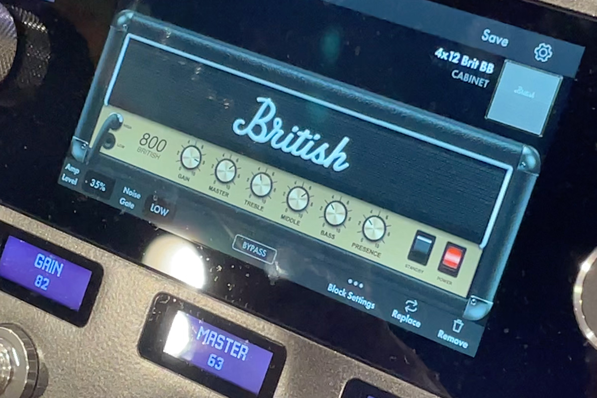 そうですね。もうちょっと音を出してみましょうか。今回の聖飢魔Ⅱとのコラボ(「No Shark No Surf – 夏地獄 -」)ではロータリー(Rotary Speaker 122)を使うんです。フェンダー系のトレモロ(Tube Bias Tremolo)も良いんだよなぁ。あと、ずっとワウはかかりっぱなしになっていて、エクスプレッション・ペダル(⑤)を踏むとオンになります。……これはマーシャル系のアンプですね。“British 800”って書いてある(笑)。