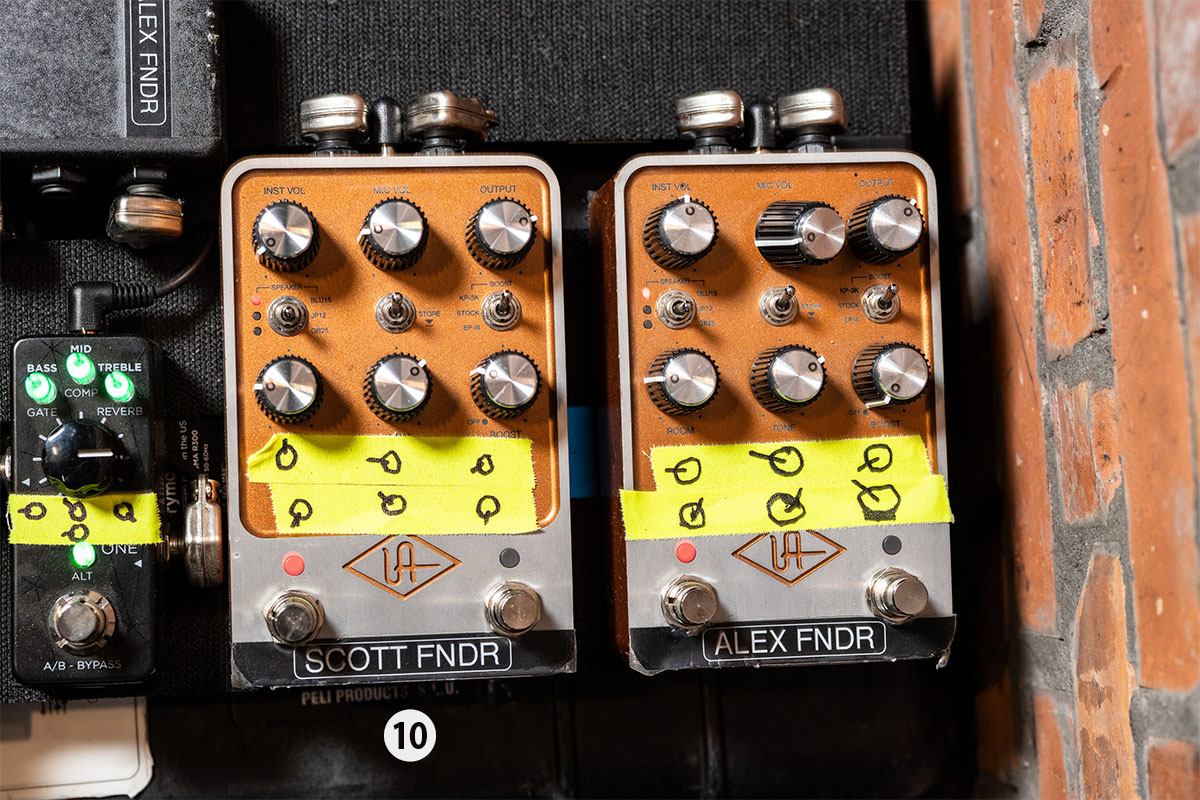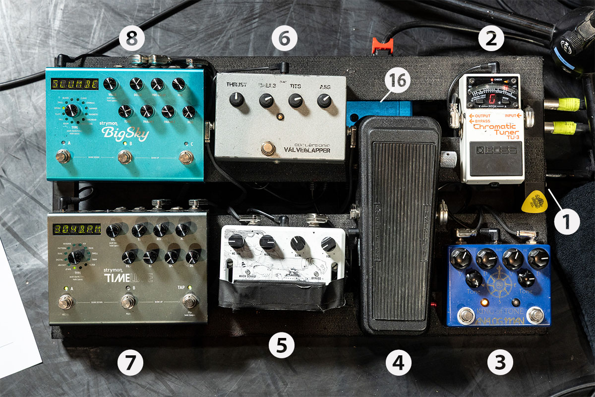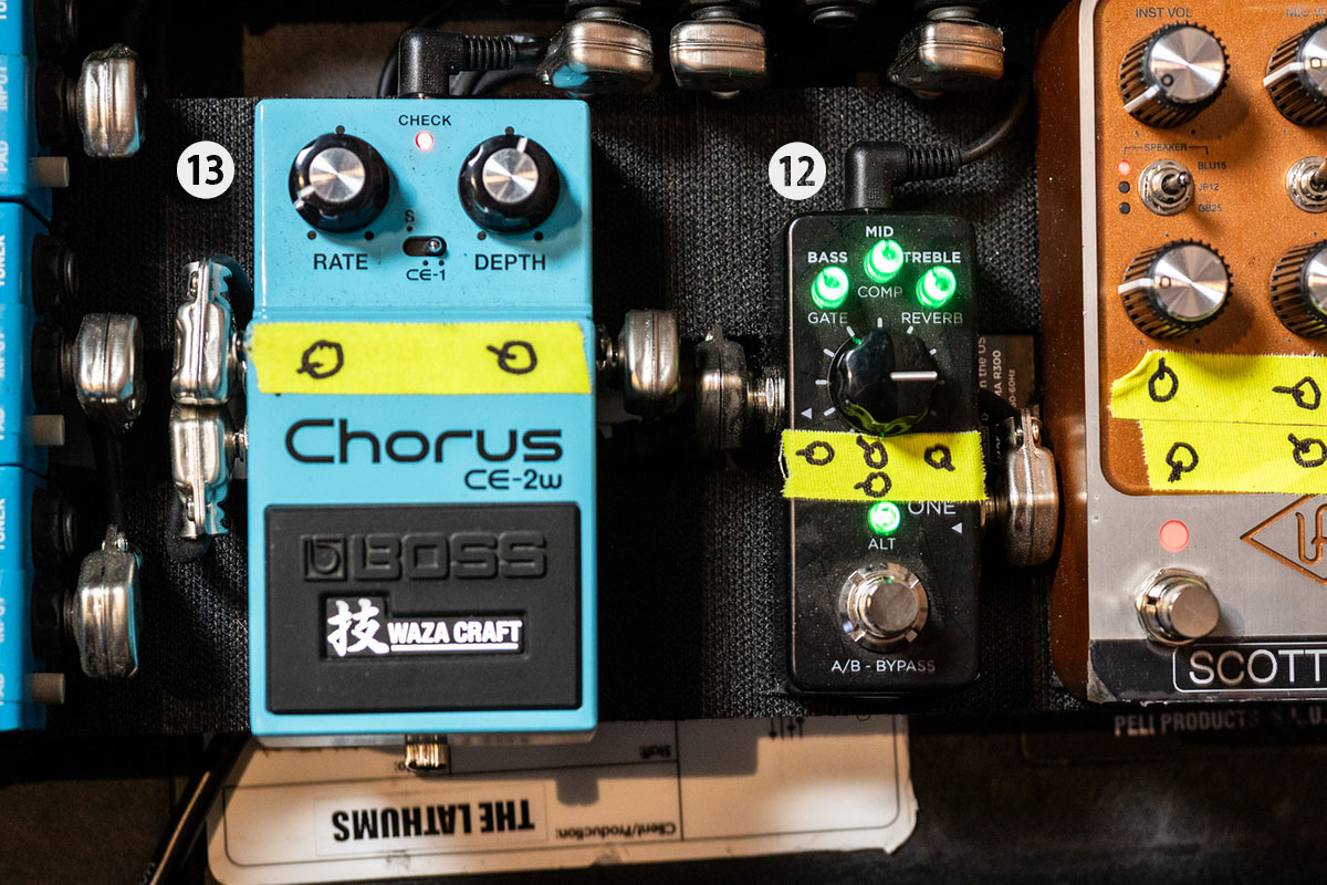 これは基本的に飛行機に乗る際のセットだね。イギリスではフェンダーのBlues JuniorとRolandのJC-40を使っていて、どっちのサウンドも同時に鳴らしているんだ。JCにはマイクを2本立てて、Blues Juniorはその真ん中に置く感じでミックスしている。今回はアンプを使わずに、TONEX One(⑫)でJCをエミュレートしていて、そのうしろにつないだCE-2W(⑬)からステレオ・アウトさせているよ。CE-2WはJCを完璧に再現していて驚いたね。今回はBlues Juniorの代わりとして、Universal Audioのアンプ・シミュレーター・ペダル(⑩)を持ち込んでいる。