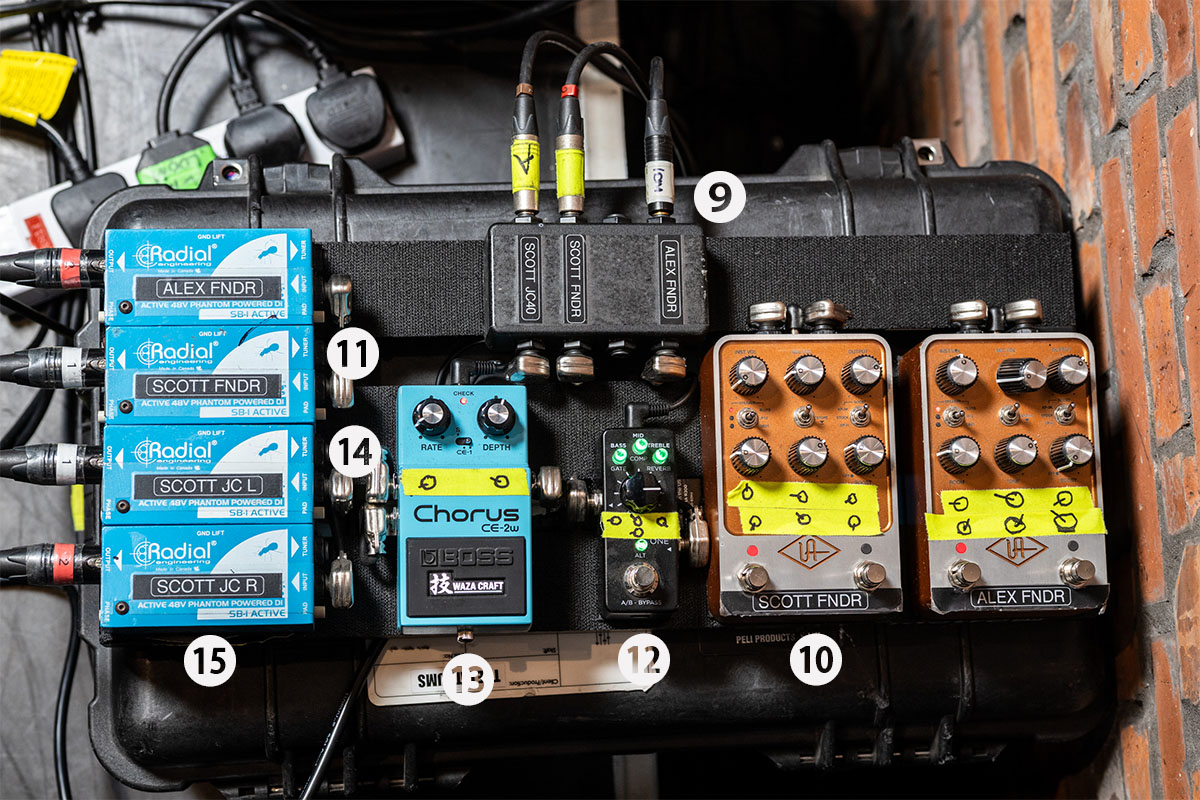 ギターからの接続順は、まずスコットの足下に置かれたボード内の①ジャンクション・ボックスを経由し、②〜⑧の番号どおりにつながれている。⑧BigSkyからステレオ・アウトになり、再び①ジャンクション・ボックスへ。そこからステージ袖に置かれたボードに接続される。