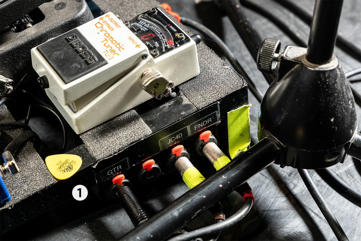 ①ジャンクション・ボックスのアウトから⑨ジャンクション・ボックスを経由し、ここから出力先が2つに分かれる。1つは50年代のフェンダーTweedアンプのサウンドをエミュレートした⑩Woodrowを通り、⑪SB-1 Activeを経由してPAへ。ちなみに、もう1台のWoodrowはアレックス・ムーア(vo,g)のもの。