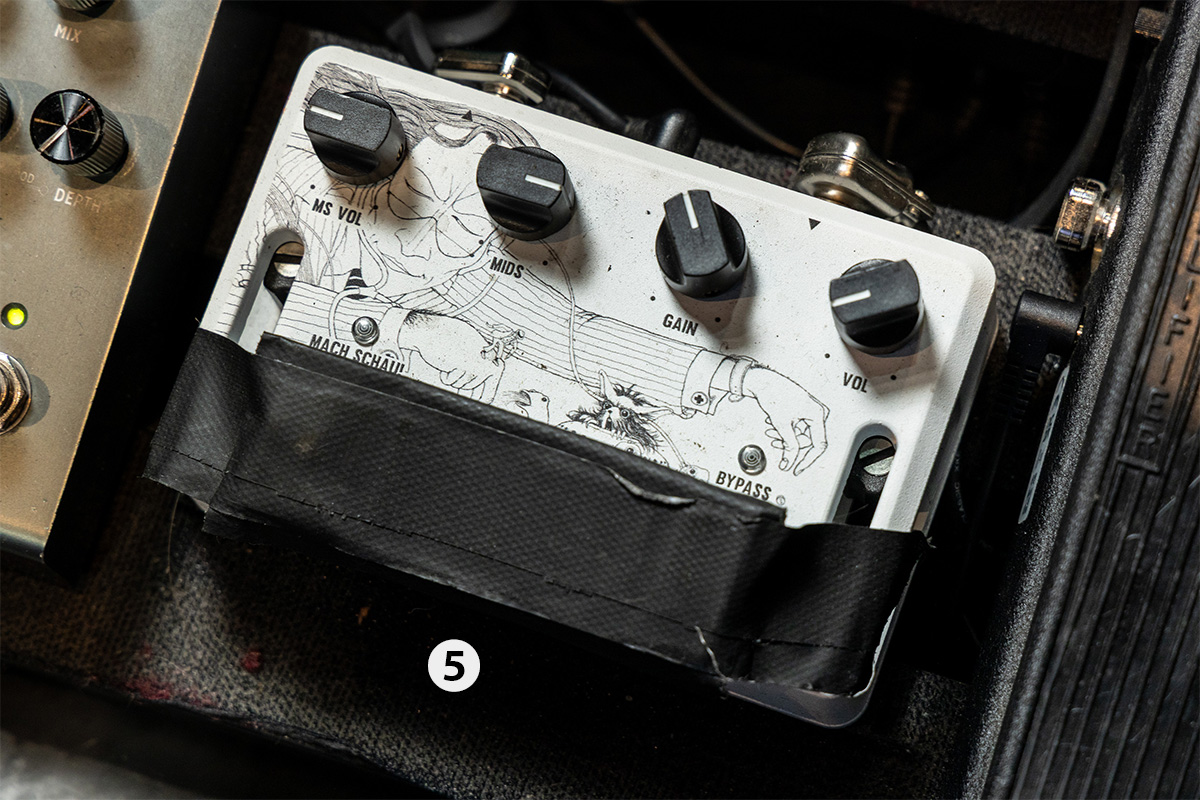 ⑤Dr. Roberは「No Direction」などのギター・ソロのみでオンにするそうで、スコットはBYPASSスイッチとMach Schau!スイッチを同時にオン/オフしている。2つのスイッチの同時オン/オフがしやすいように、ギター・テックにより板のようなものがテープで固定されていた。
