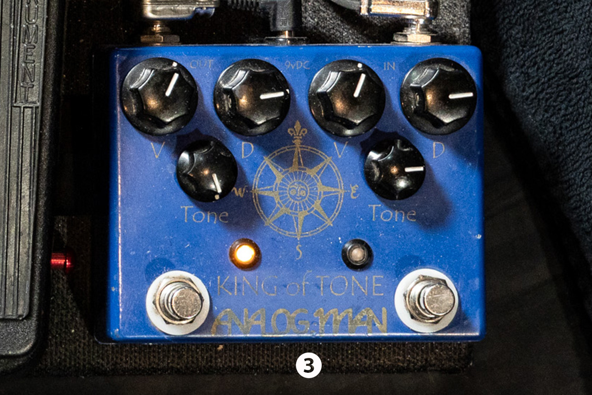 メインの歪みは③King of Toneで、左側のchを常時オン。ToneノブはMAXにセッティングされていた。ストラトキャスターのリア・ピックアップを使用するロックな楽曲では、右側のchも同時にオンにしてゲインを稼いでいる。