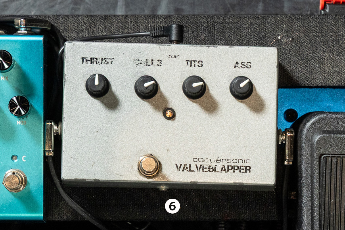 ⑥VALVESLAPPERはアークティック・モンキーズのアレックス・ターナー(vo,g)が使用していることを知り、数ヵ月かけて見つけたという1台。こちらはファズのようなサウンドのギター・ソロ用で、「Steller Cast」などでオンにしているとのこと。