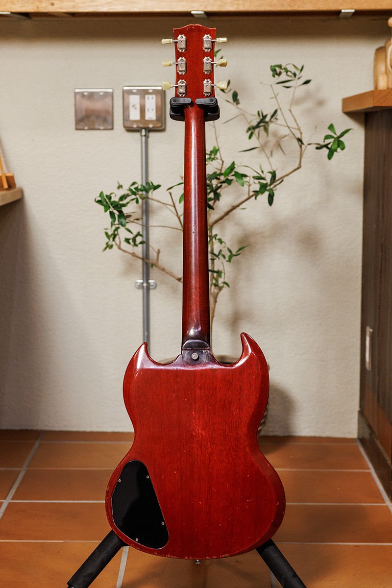 2021年に御茶ノ水の楽器店で購入した1965年製SGスタンダード。購入後にリフレットを施し、チューニングの安定性を考慮してペグが新品に交換された。
