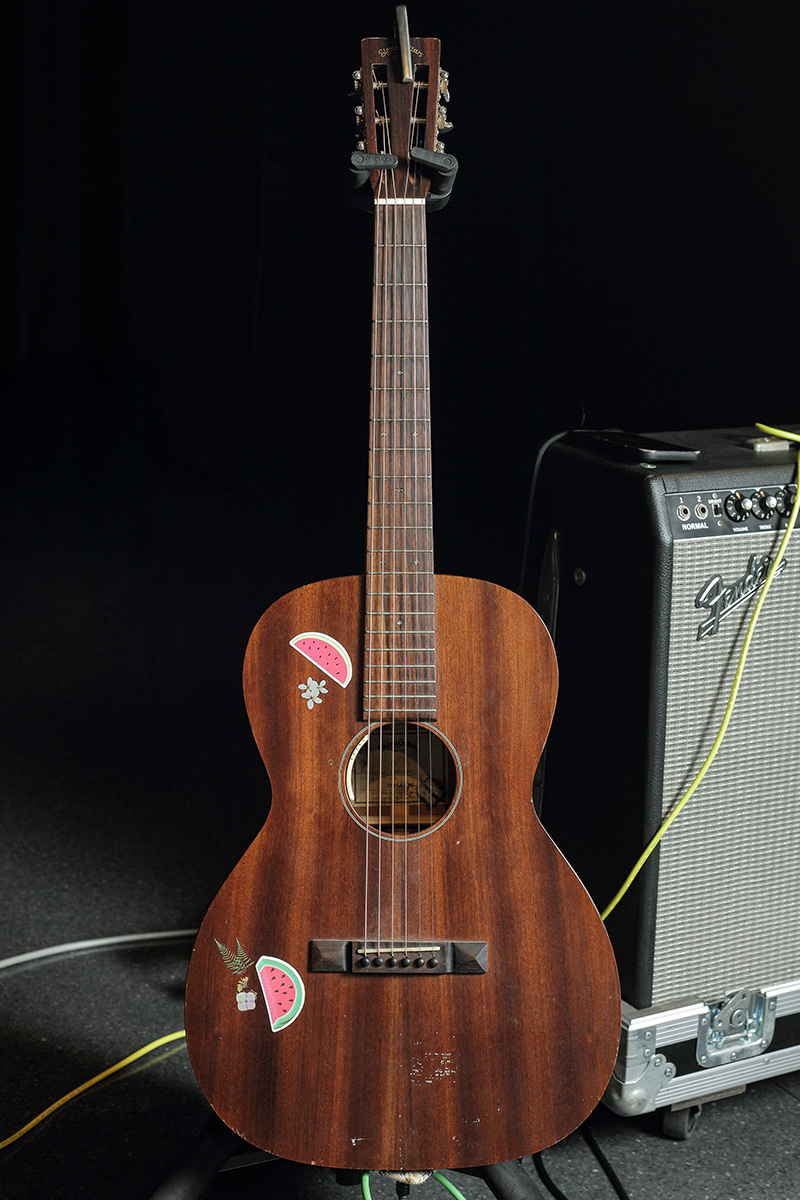 違うよ、Sigmaなんだ。実は家には、もっとずっと良くて高いアコースティック・ギターがあって、ほとんどそれを弾いているんだよね。アルバムでもそれを使ったんだ。このSigmaはアルバムのレコーディングではまったく使っていなくて、ライブ用なんだよ。その2本には同じピックアップが付いている。L.R.BaggsのAnthemで、ピエゾ・ピックアップ(Element)が搭載されているけど、僕は常にマイク(Tru-Mic)を使っているんだ。
