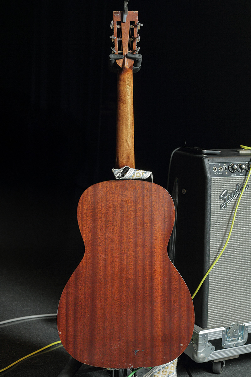 それは彼に聞いてもらわないとね。僕がこのギターを好きなのは、ナットの幅が広いからなんだ。確か1.75インチだったと思う。スタンダードなマーティンよりも幅がちょっと広いんだよ。20年代〜30年代初めのマーティンだったら、これくらいの幅かな? コードを押さえるスペースが広く取れるから良いんだよね。あとは12フレット・ジョイントになっているところ。つまり、14フレット・ジョイントよりもブリッジがサウンドホールから離れているんだ。ブリッジがブレーシングの木材の上にあることで、少し違った音が出るんだと思う。普通、小さいボディのギターは低音があまり出ないけど、これはパンチがあるんだよね。少なくとも、僕はそう認識しているんだ。