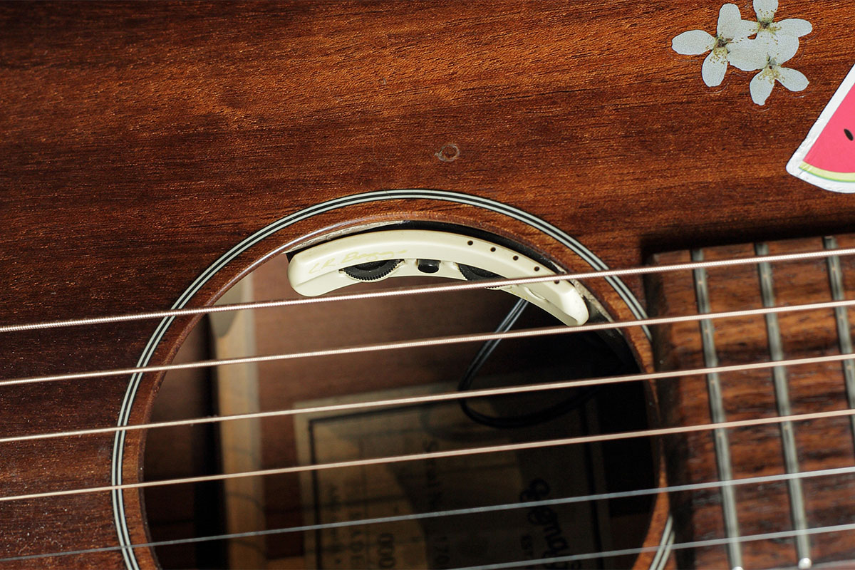 現在はマグネティック・ピックアップが取りはずされ、L.R.BaggsのAnthemをインストール。ボディ内部にTru-Mic(マイク)とElement(ピエゾ)を搭載するピックアップ・システムなのだが、ルークはマイク部分のみを使用しているとのこと。本器のサウンドはL.R.BaggsのVenue D.I.を通ってPAに信号が送られている。
