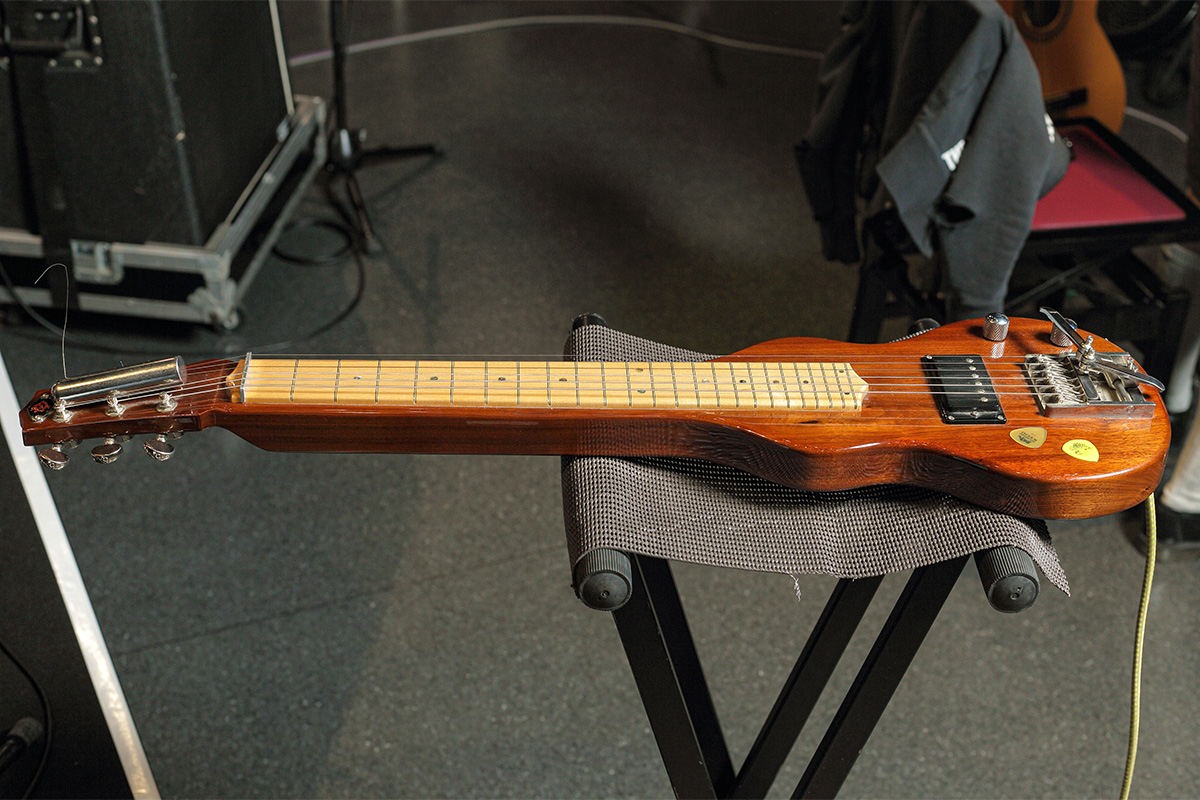 誰かが持っているのを見て、ラップ・スティールが欲しかったんだ。「Goodbye(Don’t Tell Me)」のコーラスのコードで“ウ〜ン”っていう音を出したかった時、これを見つけたんだよね。当初はMultibenderブリッジを買ってテレキャスターに付けようと思ってたんだよ。結局このラップ・スティールを買ったからテレキャスターには付けなかったけど、ブリッジは今家にあるから今度試してみるね。