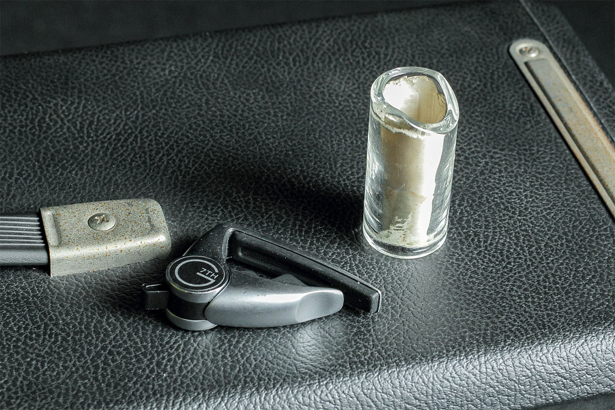 アンプの上にはカポとスライド・バーが置かれていた。ルークは「Mary」でブルージィなスライドを披露。
