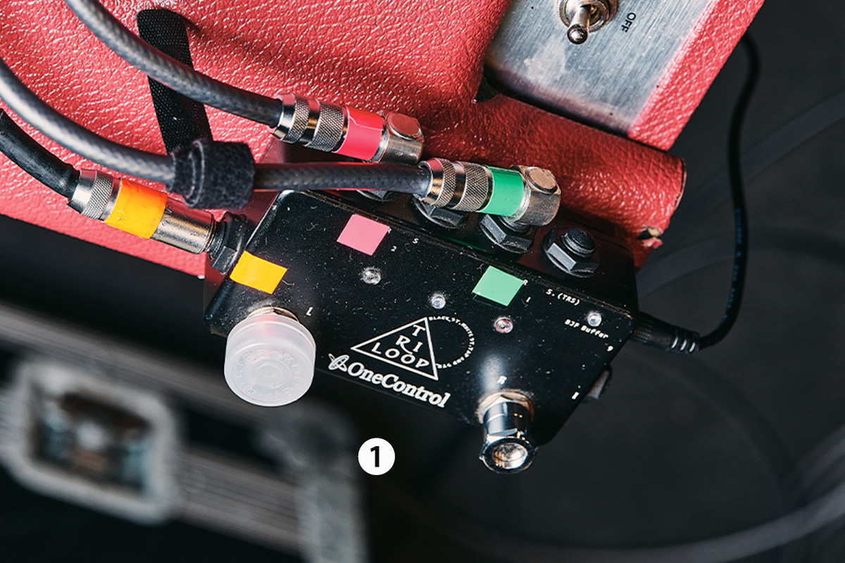 まずは、アンプの上に置かれた①Tri Loopの2つのループの各リターン端子に1本ずつギターが接続されており、ここで使用するギターを切り替えている。①Tri Loopのアウトからは、足下のボード内の②ジャンクション・ボックスを経由して③ARC-3のHTS-INへ。