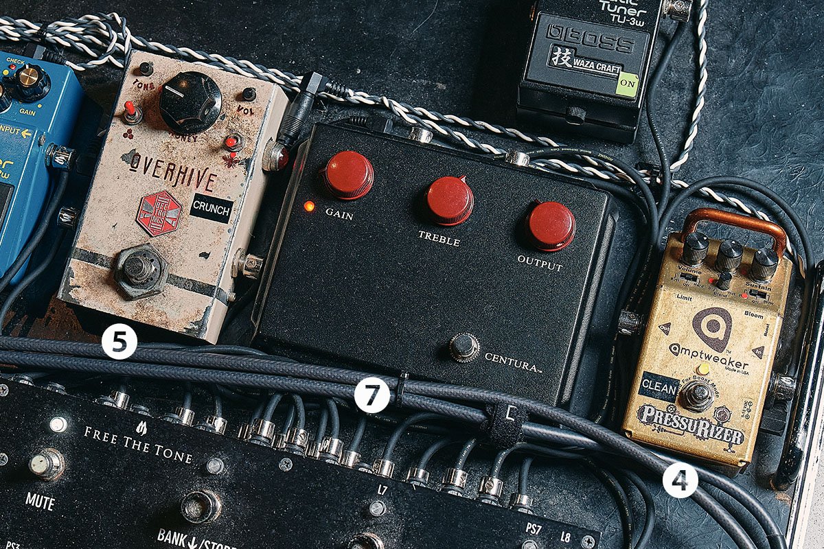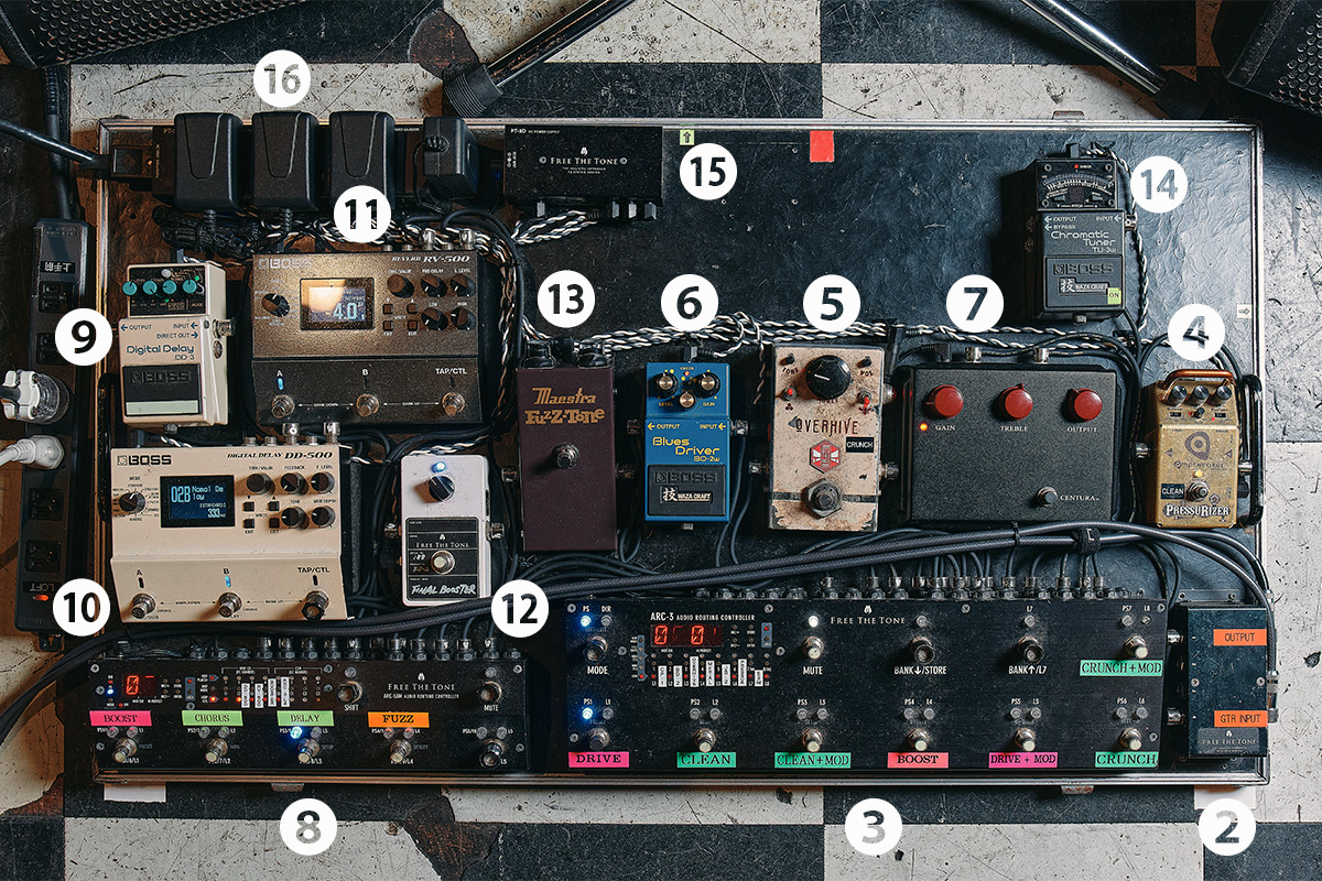 ⑦Centuraは、レコーディングの時はクランチで使っています。そういう時は⑥BD-2Wと⑦Centuraを切り替えますね。ライブでは⑦Centuraは“BOOST”のプリセットで、⑥BD-2Wと組み合わせて使っています。