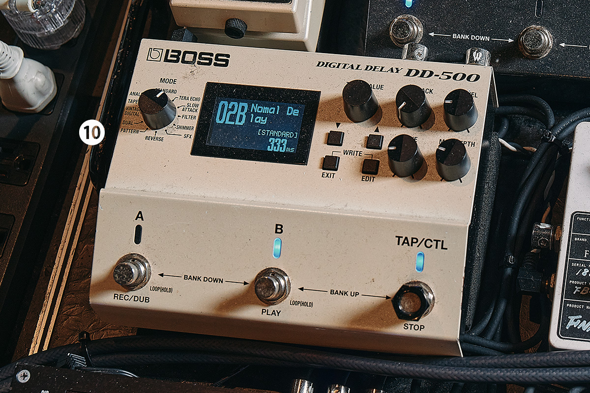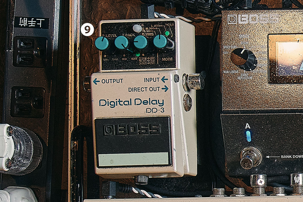 ディレイは2台用意されており、⑨DD-3はF.BACKノブをMAXに設定してリピートをくり返す飛び道具で、⑩DD-500はSTANDARDモード、ディレイ・タイムが333msのオーソドックスなディレイという使い分け。ホリエはすべての楽曲で同じディレイ・タイムを使用しているとのこと。