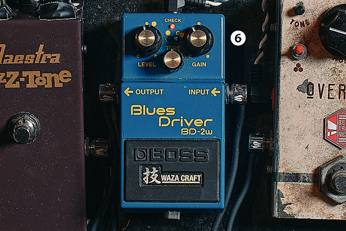 ⑥BD-2Wですね。“Blues Driverってブルースマンが使うものなのかな?”と思っていたんですけど、弾いてみたらめちゃくちゃ良くて(笑)。BOSSのオーバードライブを何台も試した結果、Blues Driverが一番良かったんです。抜けが良いというか、つぶれずに歪んでくれる。