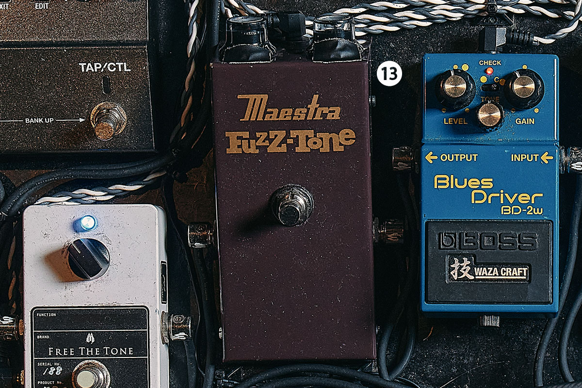 「メタセコイアと月」の歪んだパートでゴリゴリの音を試してみたく、ホリエが初めて導入したファズが⑬MAESTRA Fuzz-Tone。ファズを10台ほど試奏した結果、本機のサウンドが圧倒的に良かったとのこと。歪ませても音抜けが良いところが気に入っているそうだ。「メタセコイアと月」の該当パートのレコーディングでは本機のみで録音したが、ライブでは⑥BD-2Wと同時にオン。インピーダンスの関係で、⑧ARC-53MのLoop 5(セパレート・ループ)を駆使した特殊な接続順を用いている。