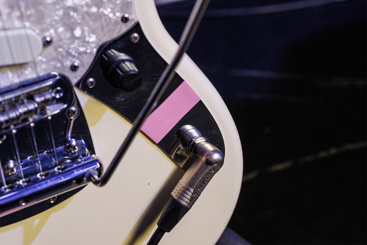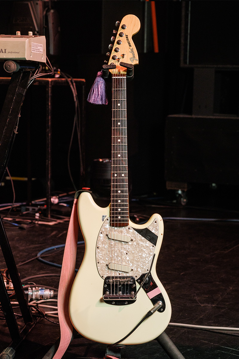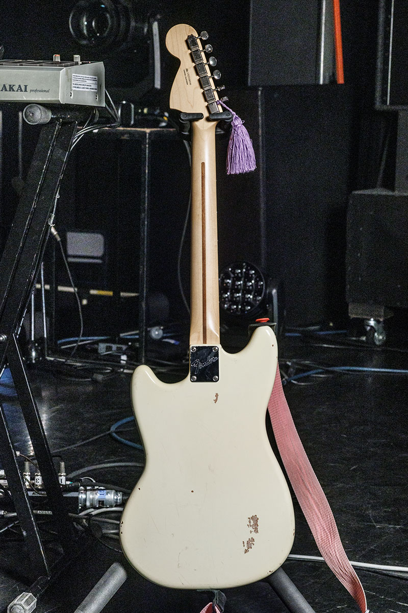 ジョシュアの使用ギターは、American Performerシリーズのムスタングのみ。2024年頃に入手したものだ。本モデルはもともとはポリウレタン塗装なのだが、ジョシュアが手に入れる際、フェンダーが特別にラッカー塗装でリフィニッシュを施してくれたという。