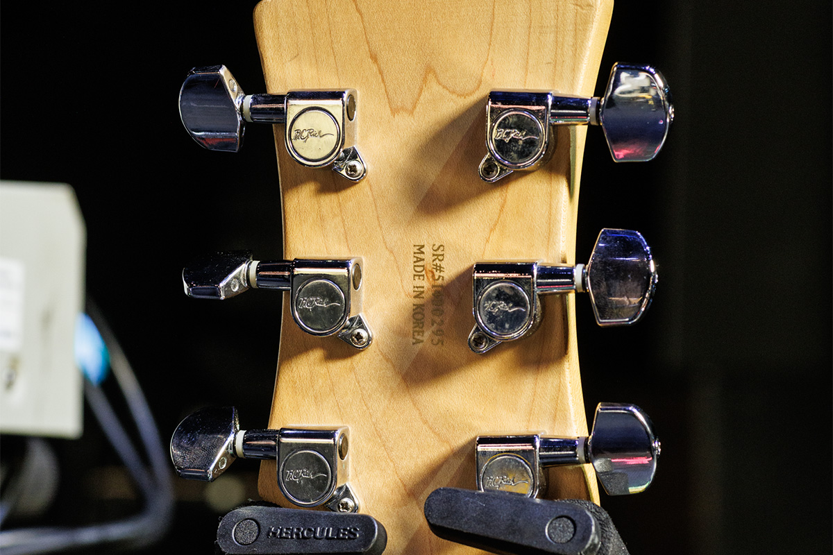 韓国で製造されたもので、シリアル・ナンバーは“#51400295”。ネックはメイプルで、指板はローズウッド。Mockingbird Acrylicはヘッドまでアクリルで作られたモデルもあるのだが、本器のヘッドはメイプルが採用されている。