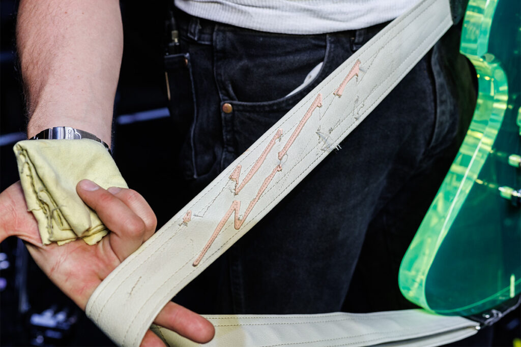 ネック・サイドには6弦の音名が書かれたシールが貼られていた。ギター・ストラップはスタイリストが製作したオリジナルとのこと。
