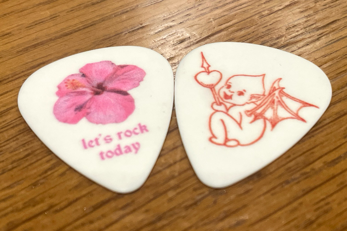 ピックはJim DunlopのTortex Standard 0.88mm。イラストはオリジナルで、リアン・ティーズデールも同じピックを使用している。
