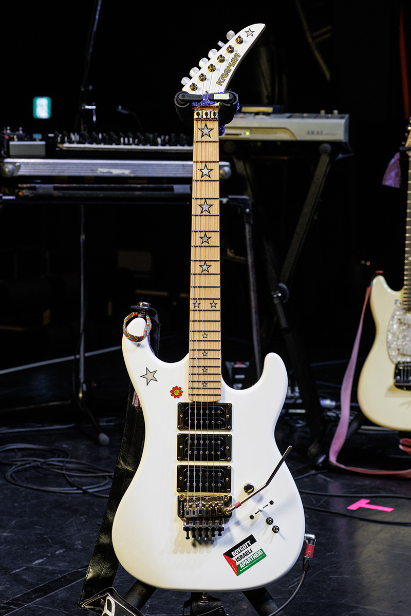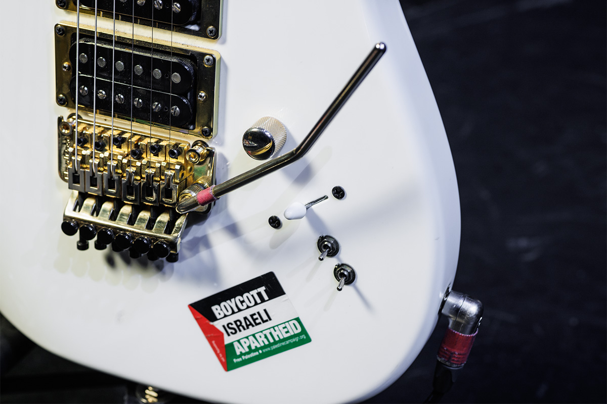ボディ下部に貼られた、イスラエルのアパルトヘイトへのボイコット訴えかけるステッカーは、以前メインで使用していたJersey Starにも貼られていた。